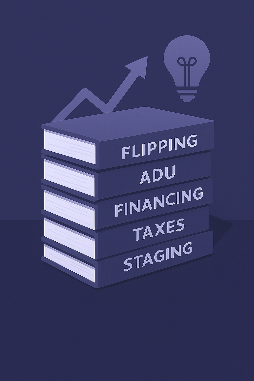 Our Playbooks deliver frameworks that investors, flippers, and homeowners can put into practice immediately. Covering everything from ADUs and creative financing to tax strategies, staging, and pricing, these guides give you the edge to maximize property value and reduce risk.